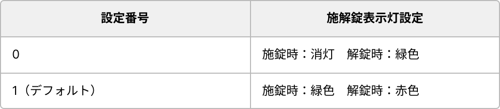 電気錠設定モード「6:施解錠表示灯設定」にて、下表のいずれかの表示動作に設定することが可能です。